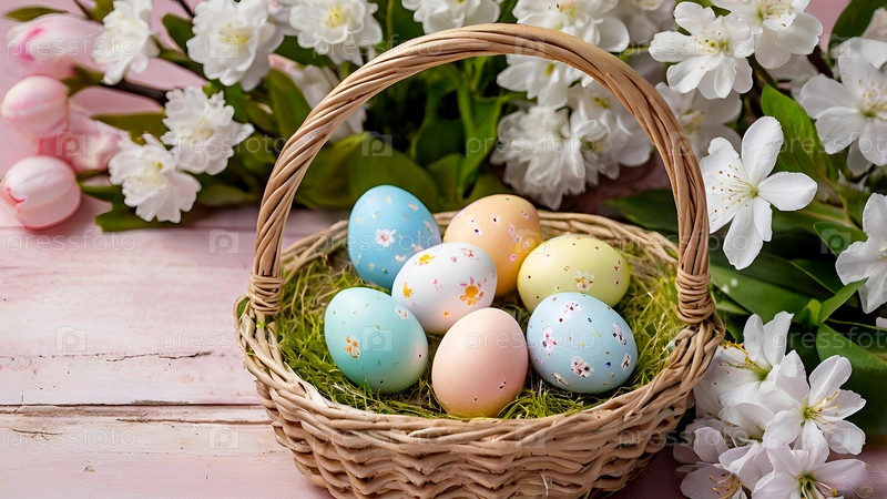 Красивый фон с пасхальными яйцами в плетеновой корзине и весенними вишневыми цветами