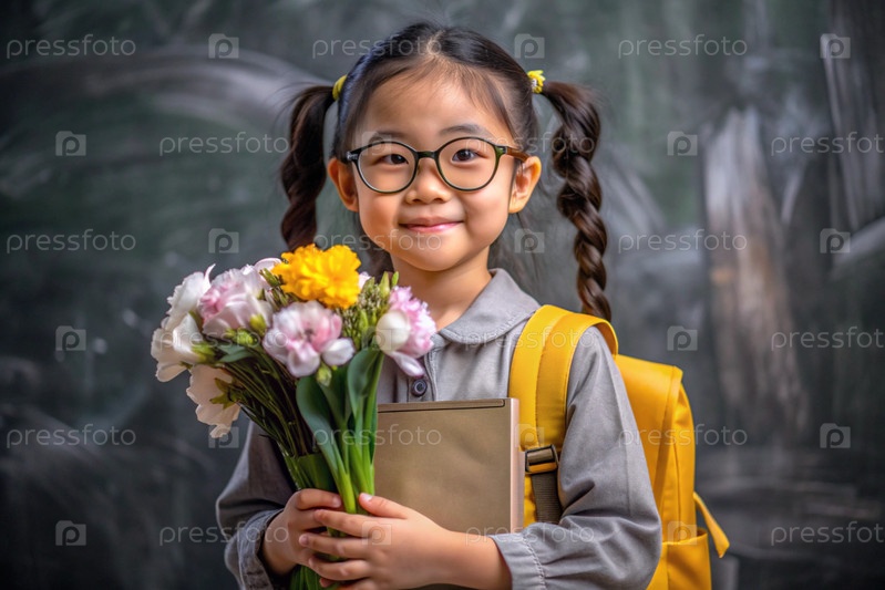 Первоклассный азиат с очками на доске. Девушка держит цветы в руках. Ребенок пойдет в школу впервые. Ребёнок с рюкзаком, книгой и цветами. Возвращение к школе