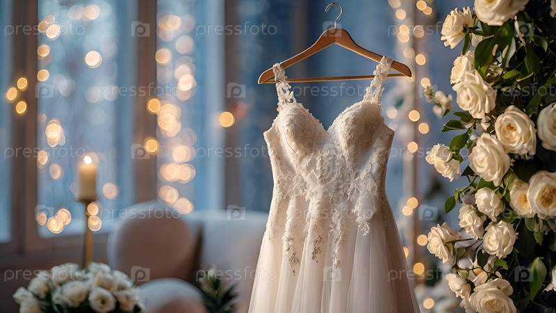 Близко. Элегантное белое свадебное платье на вешалке и букет цветов. Утро невесты. Аренда и покупка свадебных платьев для мероприятий