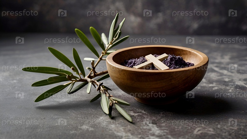 Религия, вера, литургия, Пепельная среда.Огромное заимствование: деревянный крест, церемониальная пепла и оливковая ветвь на сером фоне