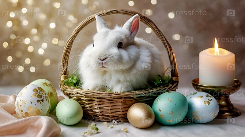 Нежные пасхальные яйца, кролик и деликатные цветы на пастельном акварельном фоне с нежными венами