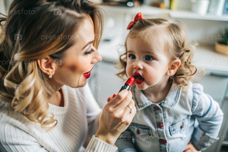 Мама красит сладкую, смешную помаду своей маленькой дочери красной.Девочка играет с женской косметикой