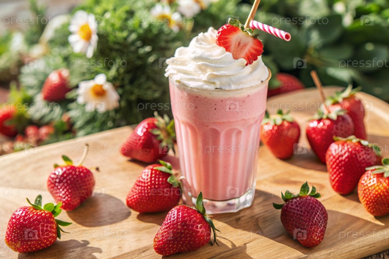 Освежающий клубниковый молочный коктейль с битой сливкой и соломой на столе, окруженном свежими ягодами