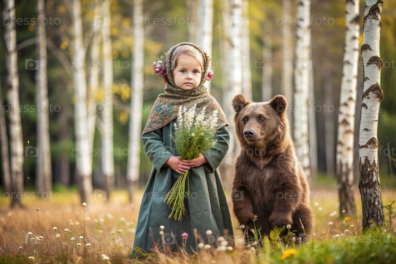 Красивая маленькая девочка в русской народной одежде и с платками на голове в березовой роще с живым медведем Русский фольклор, славянская мифология
