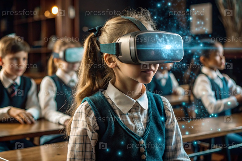 Девочка с очками виртуальной реальности. Ребенок находится в классе, а другие ученики на заднем плане. Цифровой интерфейс отображается в наушниках