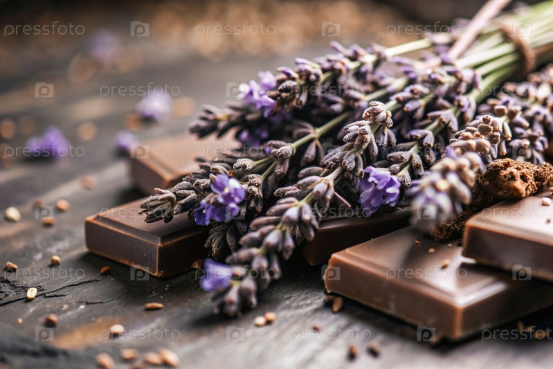 Кусочки шоколада с веточками лаванды для десерта на деревянном фоне