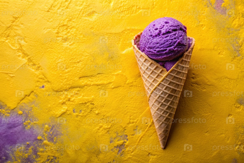 Сладкий десерт. Стильная современная концепция. Фиолетовый конус мороженого на ярко-желтом фоне. Всемирный день мороженого