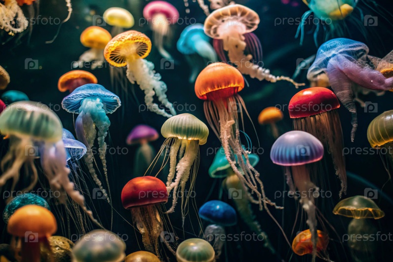 Скуба дайвинг. Дайвинг. Красочные медузы плавают в тропических водах. Медузы в подводном мире диких животных. Наблюдение за океанической фауной