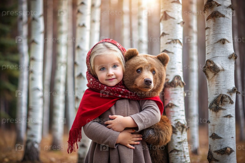 Красивая маленькая девочка в русской народной одежде и с платками на голове в березовой роще с живым медведем Русский фольклор, славянская мифология