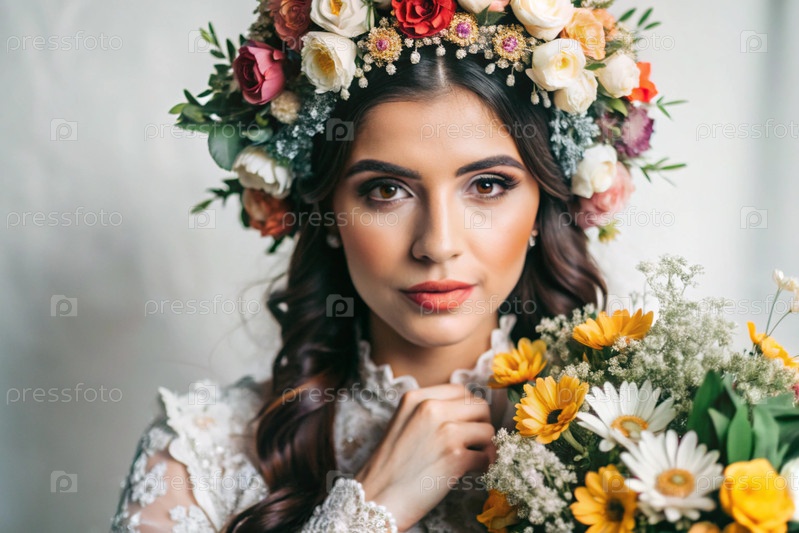 Портрет красивой молодой женщины в крупном плане с цветочной тиарой или венком на голове на белом фоне. испанская культура, латиноамериканское наследие