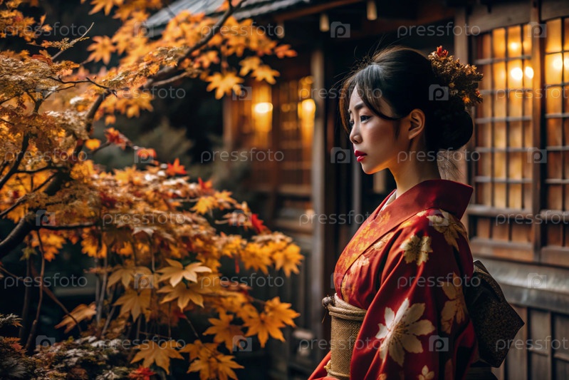Японская девушка в традиционном национальном костюме - кимоно. На сказочном фоне фонарики и осенние деревья. Портрет символизирует традиции и культуру народа Японии