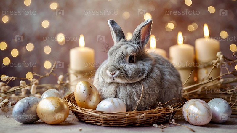 Нежные пасхальные жемчужинные яйца в корзине, кролик и нежные цветы на пастельном аквареле