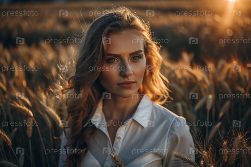 Молодая девушка в белой рубашке с золотыми волосами стоит на поле спелой золотистой пшеницы при закате солнца.Урожай, сельская природа и жизнь