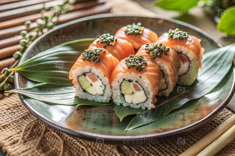 Японская еда. Суши-роллы Калифорния, Филадельфия с угорьем, красной икры и лососем. Концепция меню суши-бара