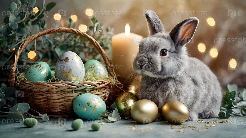 Нежные пасхальные яйца, серый кролик и зеленые ветви эвкалипта на пастельном акварельном фоне с нежными венками