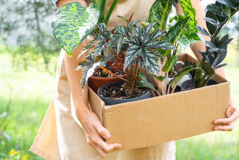 Цветочник упаковывает комнатные растения в коробку для доставки покупателю.Продажа, безопасная отправка растений из магазина, посылка.Цветочный магазин, домашний малый бизнес, питомник