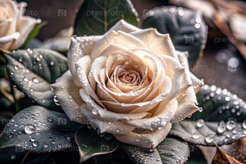 Кремовая роза красивого цвета кофе или шампанского, покрытая росой на рассвете. Красивое солнечное сияние. Фон изображения выполнен в зеленых и бежевых тонах. Естественный, экологически чистый естественный фон