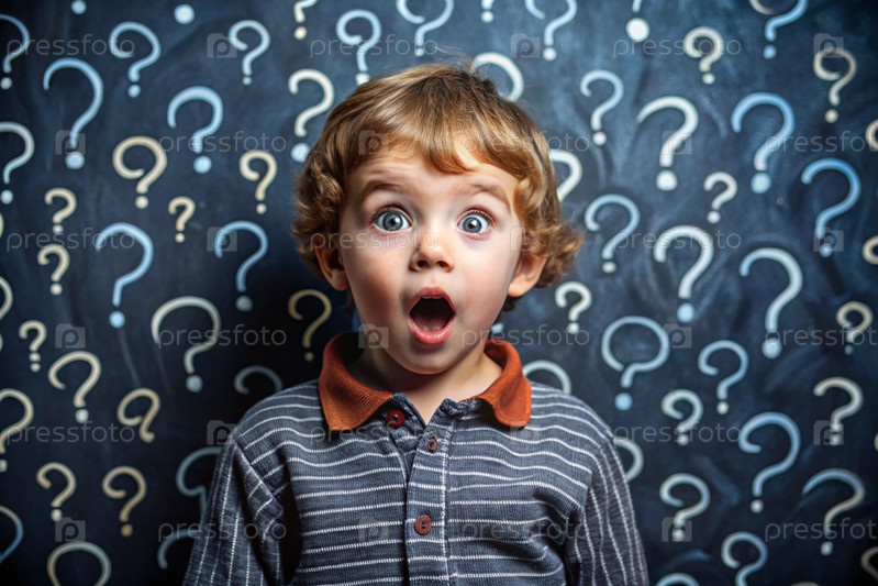 Развитие и образование детей. удивленный мальчик на темном фоне с вопросительными знаками. мозговой штурм, вопросы детей и концепция идеи