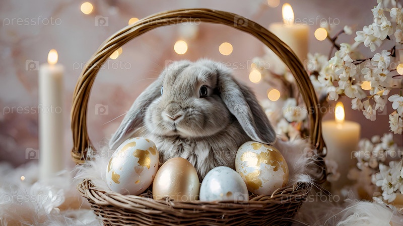 Нежные пасхальные жемчужинные яйца в корзине, кролик и нежные цветы на пастельном аквареле