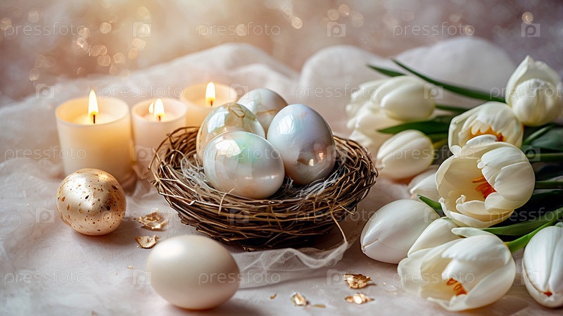 Нежные пасхальные яйца в жемчужной корзине и нежные цветы на пастельно-водном фоне