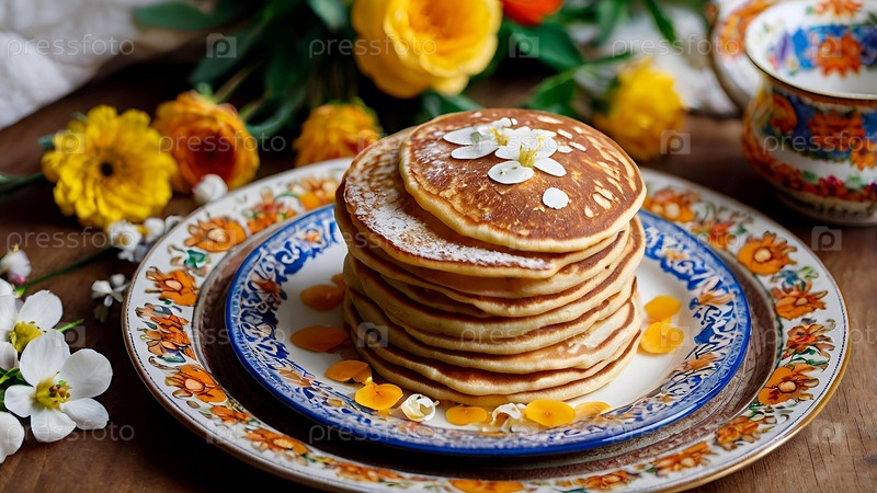 Традиционные российские блины выложены на декоративной плите на фоне яркой керамики и весенних цветов