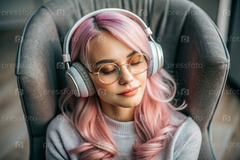Молодая красивая девушка с розовыми волосами слушает музыку в больших беспроводных наушниках дома, на стуле в гостиной
