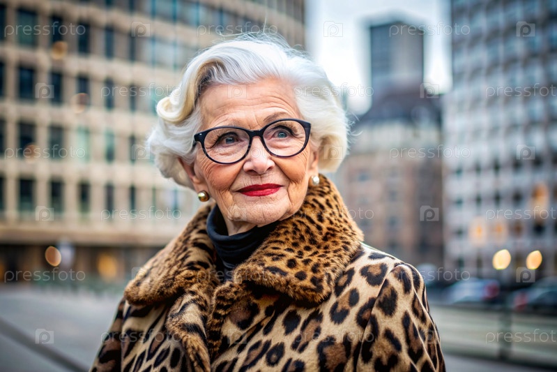 Портрет стильной, модной пожилой женщины, пенсионерки 70 лет на улице города в очках и одежде леопарда