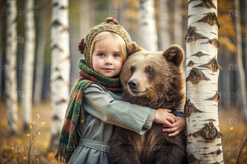 Красивая маленькая девочка в русской народной одежде и с платками на голове в березовой роще с живым медведем Русский фольклор, славянская мифология