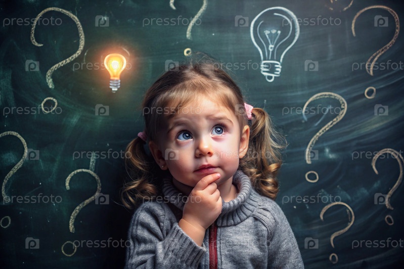 Развитие и образование детей. Вдумчивые девочки на темном фоне с лампочкой и вопросительными знаками. Брайнсторминг и концепция идеи