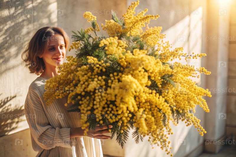 Красивая девушка с пушистым букетом мимозы. Близко Концепция весны и Международный женский день 8 марта