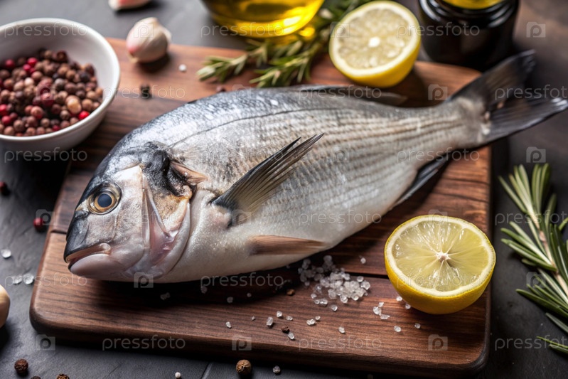 Вкусная и здоровая рыба. сырой дорадо с лимоном и ингредиентами на темном фоне. баннер, меню, место для текста рецепта, верхний вид