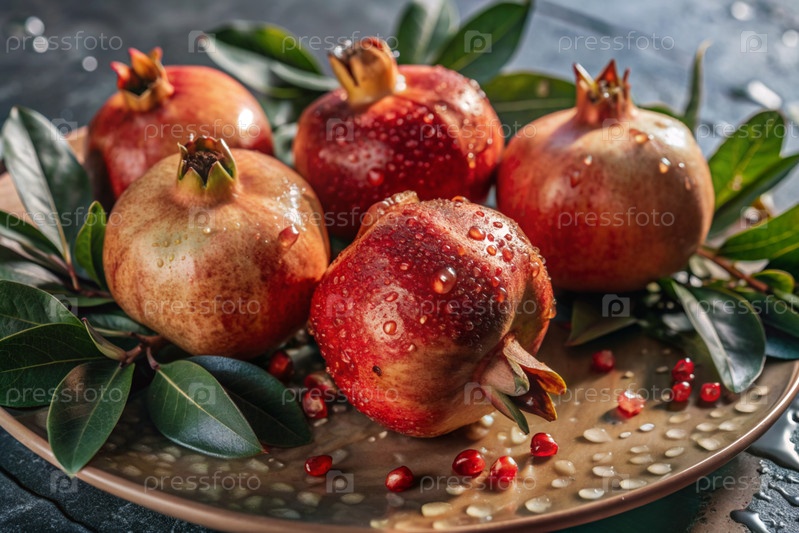 Свежие красные гранаты. Вкусные фрукты ярко-красного цвета с капельками воды. Вегетарианство. Здоровое питание. Свежие плоды на столе