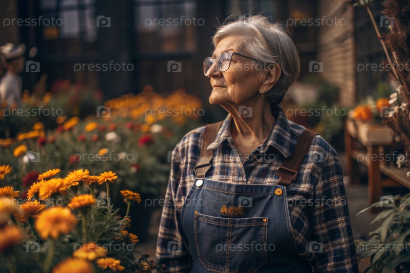 Пожилой садовник с седыми волосами в комбинезоне в уютной цветочной теплице
