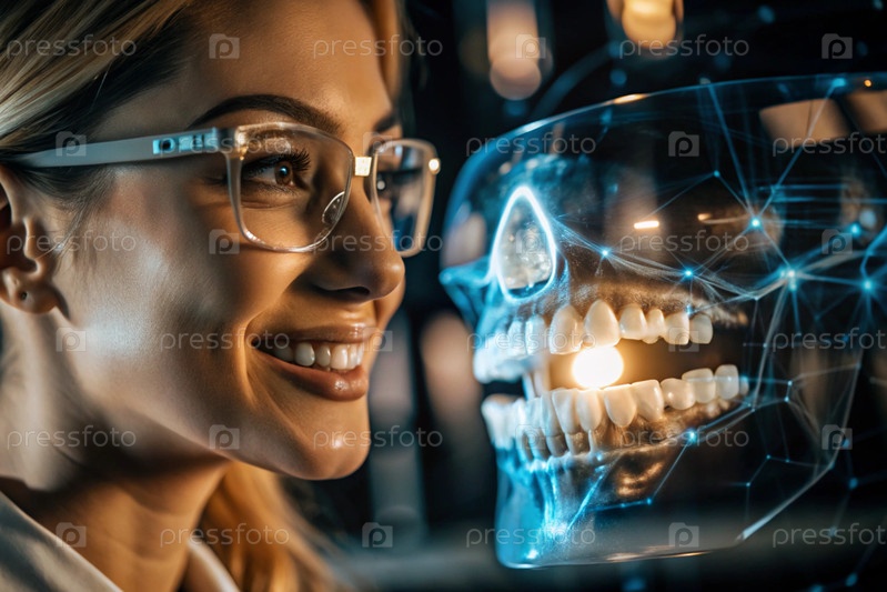 Новые технологии цифрового искусственного интеллекта в зубных протезах. Имплантаты. Женщина-стоматолог с идеальной улыбкой и цифровая графика на виртуальном экране. Концепция стоматологического здоровья и ухода за зубами