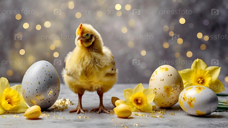 Нежные пасхальные яйца, желтые куры, цветы цыплят и нарцисс на фоне пастельного акварели с нежными венами