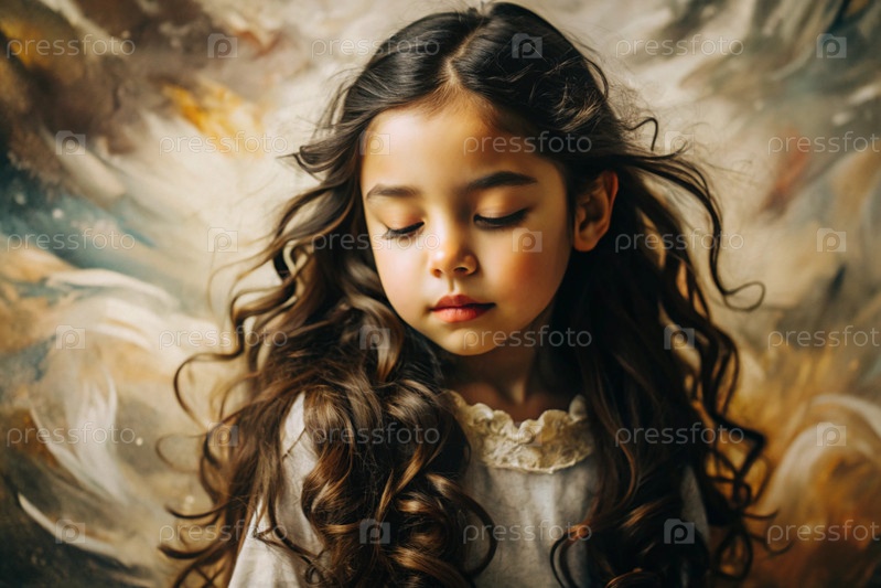 Портрет красивой маленькой брюнетки с длинными волнистыми волосами и вдумчивым взглядом.Волосы развиваются и создают ощущение легкости и естественности