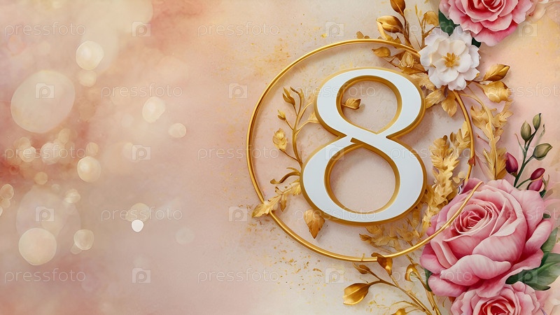 Международный женский день. праздник приходится на 8 марта. баннер, флаер. праздничный, золотой цветочный фон с номером 8