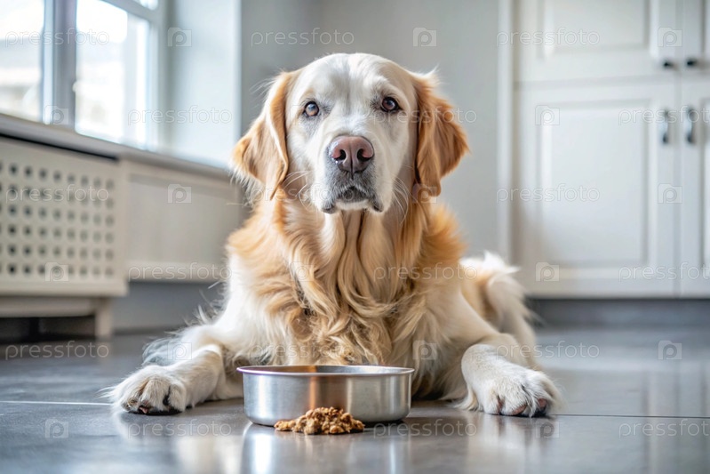 Милая собака золотого ретривера рядом с миской на белой кухне.Собака смотрит в камеру.Уход за животными
