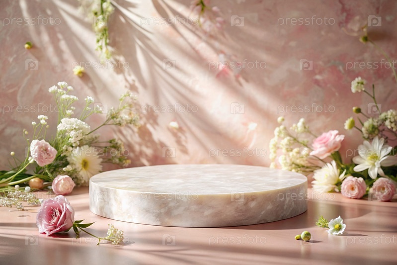 Минималистский розовый пастельный фон для демонстрации продукта.Современная подиум с розовой стеной и цветами вокруг.Креативный дизайн презентации продукции