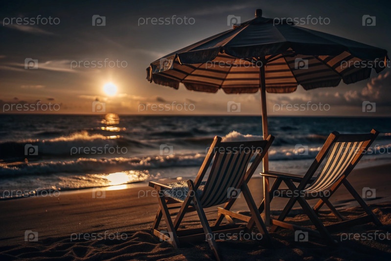 Пляжный стул и зонтик, на белом песке у океана или море с тенями. Солнечный свет. Концепция моря, пляжного отдыха и курортов