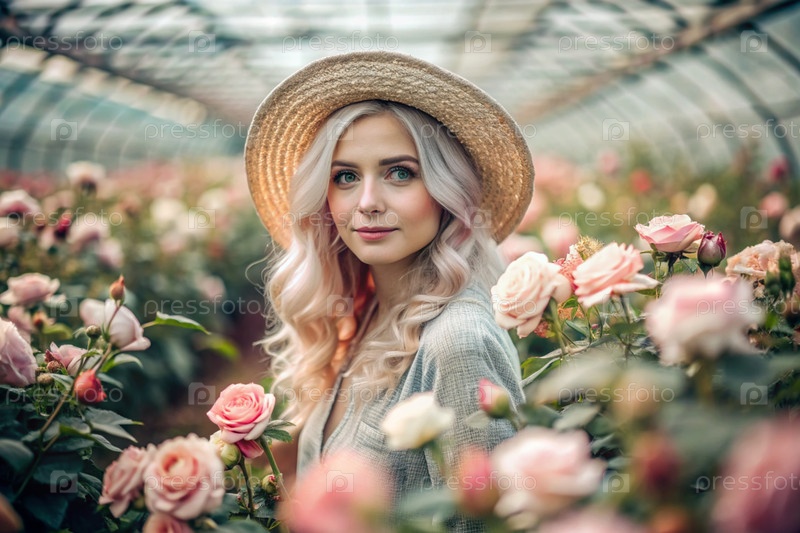 Портрет красивого садовника с розовыми волосами в соломенной шляпе, работающего с розами в стеклянной теплице