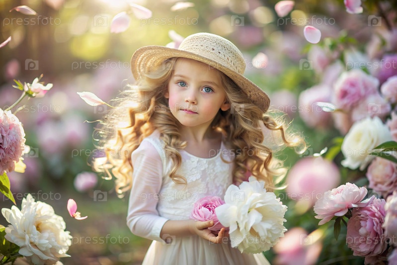 Портрет красивой маленькой кудрявой 4-летней девочки в соломенной шляпе и платье в цветущем саду пиоников. Детство. Ребенок позирует и смотрит на камеру