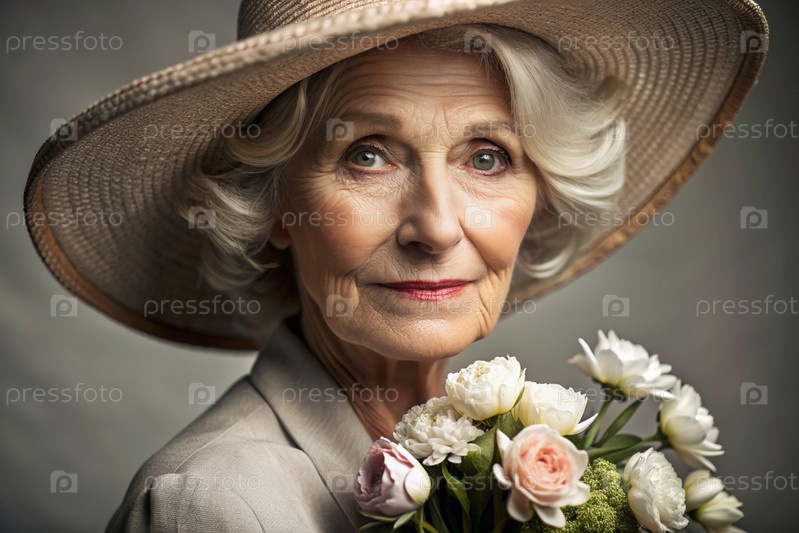 Минимализм.Студийный портрет стильной, элегантной пожилой женщины, 70-летнего пенсионера в интерьере и одежде спокойных тонов.Концепция пожилых людей