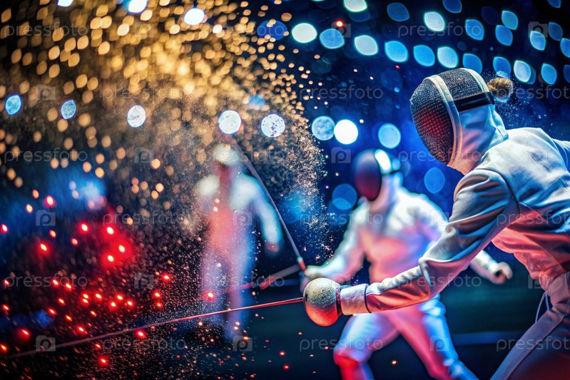 Фехтовальщики на арене с рапирами в руках во время тренировок дерутся в дуэли. Спортивное фехтование. Фехтование является типом летних Олимпийских игр