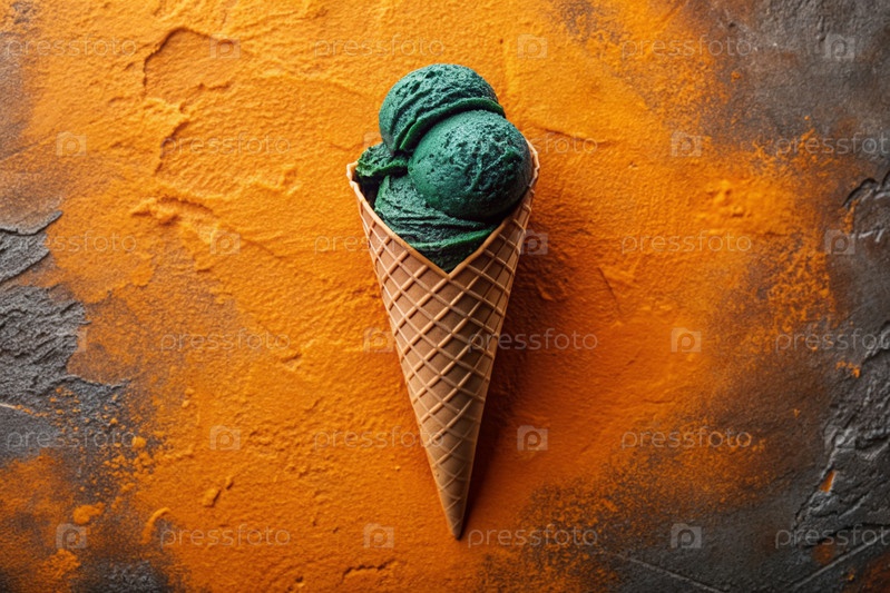 Сладкий десерт. Стильная современная концепция. Зеленый конус мороженого на ярко-оранжевом фоне. Всемирный день мороженого