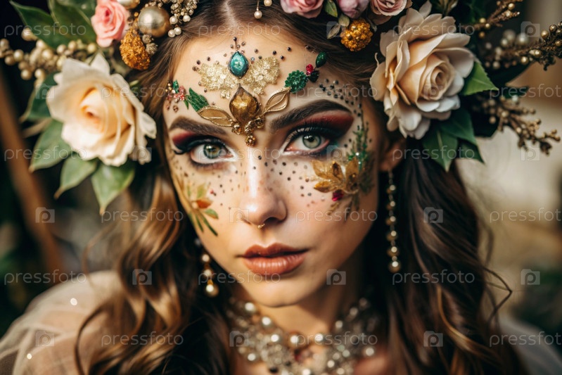Портрет женщины с красивым макияжем, блестящими элементами, рисунками на лице и цветами в волосах
