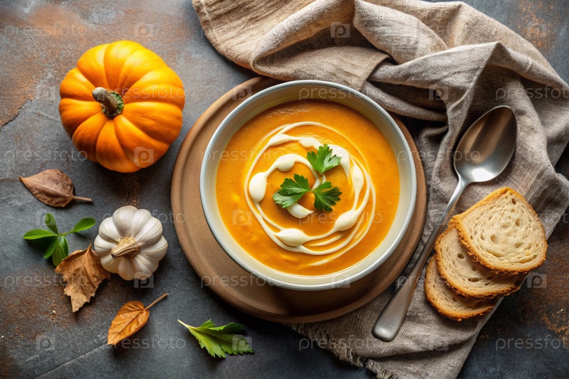 Традиционный мягкий тыквенный суп с сливками и семьями тыквы на коричнево-бежевом фоне