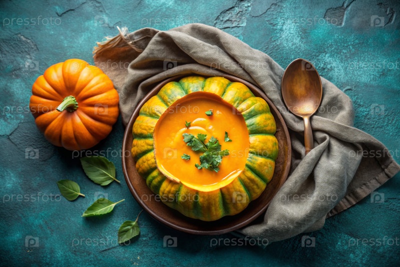 Традиционный мягкий тыквенный кремовый суп с сливками и семьями тыквы на бирюзовом бетонном фоне