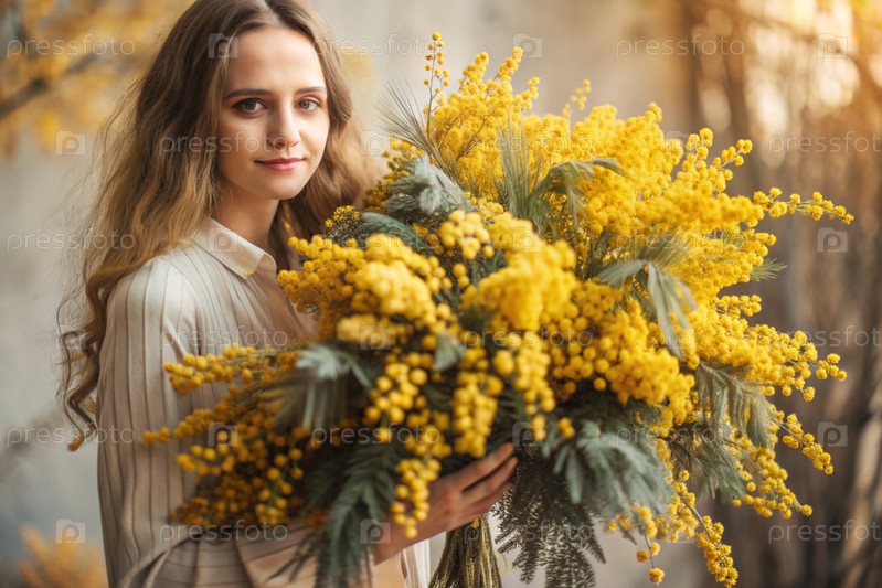 Красивая девушка с пушистым букетом мимозы. Близко Концепция весны и Международный женский день 8 марта