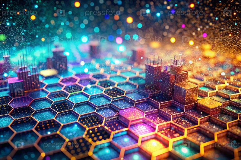 Высокотехнологичный материал. Близкий план клеточного рисунка с многоцветными огнями, создавая абстрактный и футуристический дизайн. Концепция развития и технологии будущего